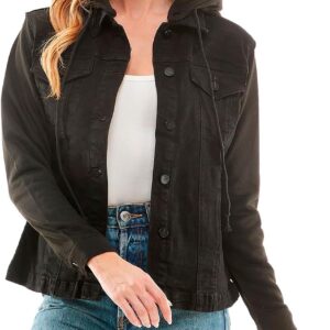 Amazing Ladies’ Denim Jacket with Fleece Hoodie – Presents for Women – Fashion Women Clothing – Black, S