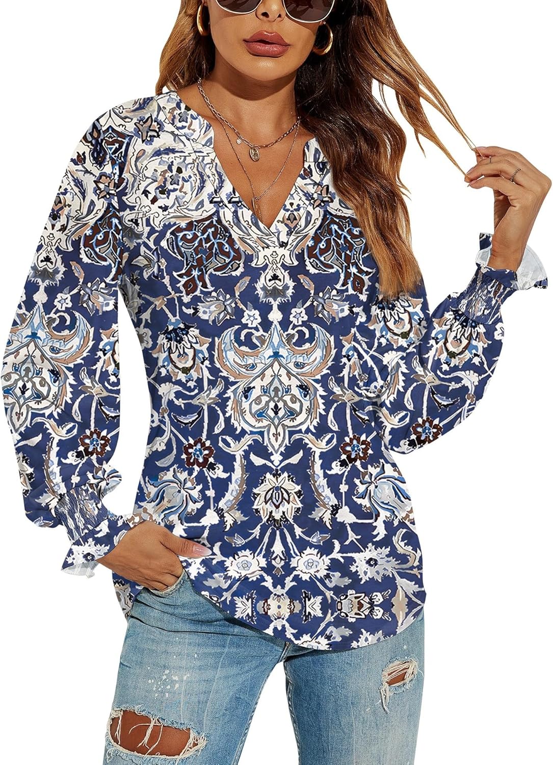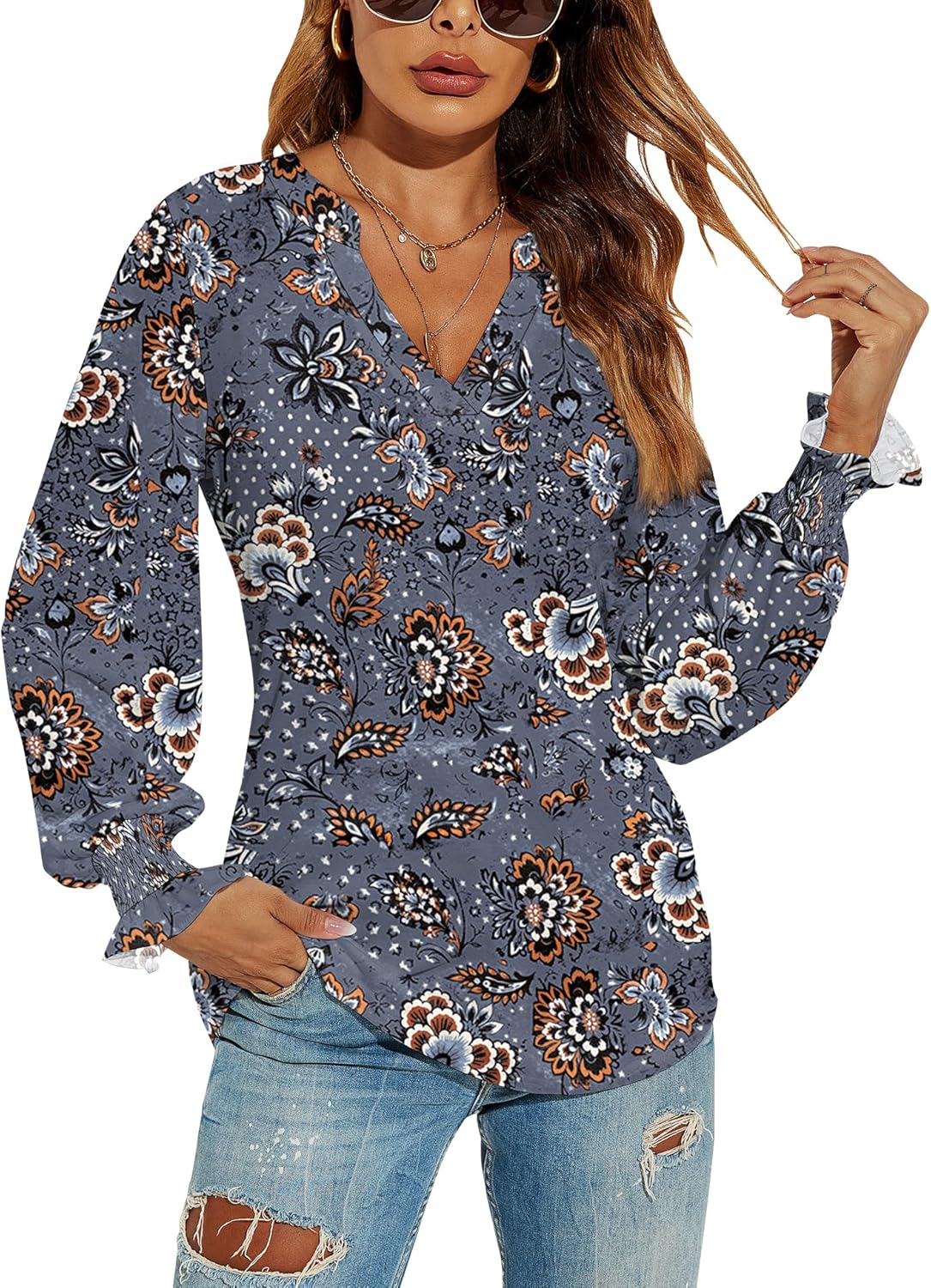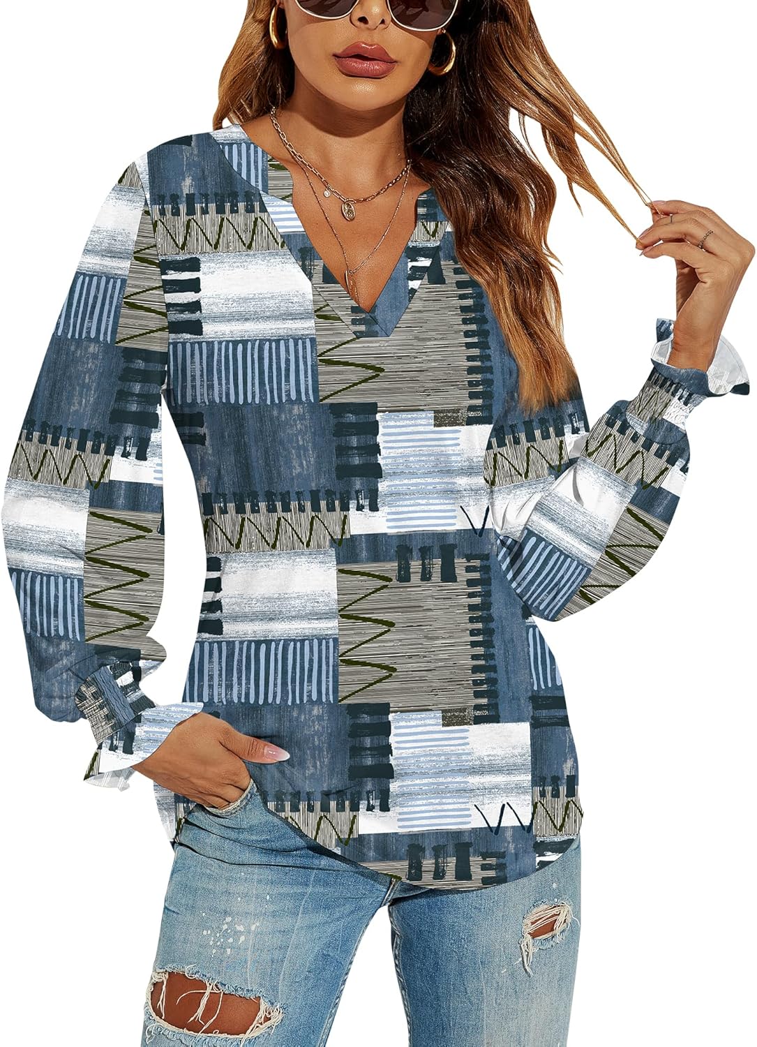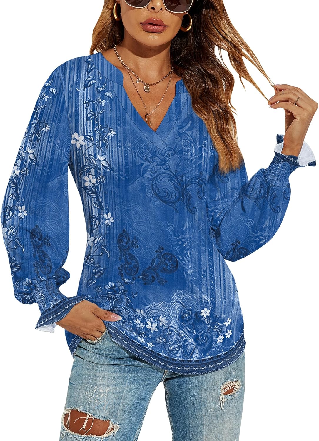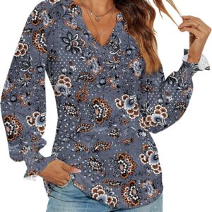 Romanstii Women's Casual V-Neck T-Shirts Loose Puff Long Sleeve Tops Tunic Blouses quantity