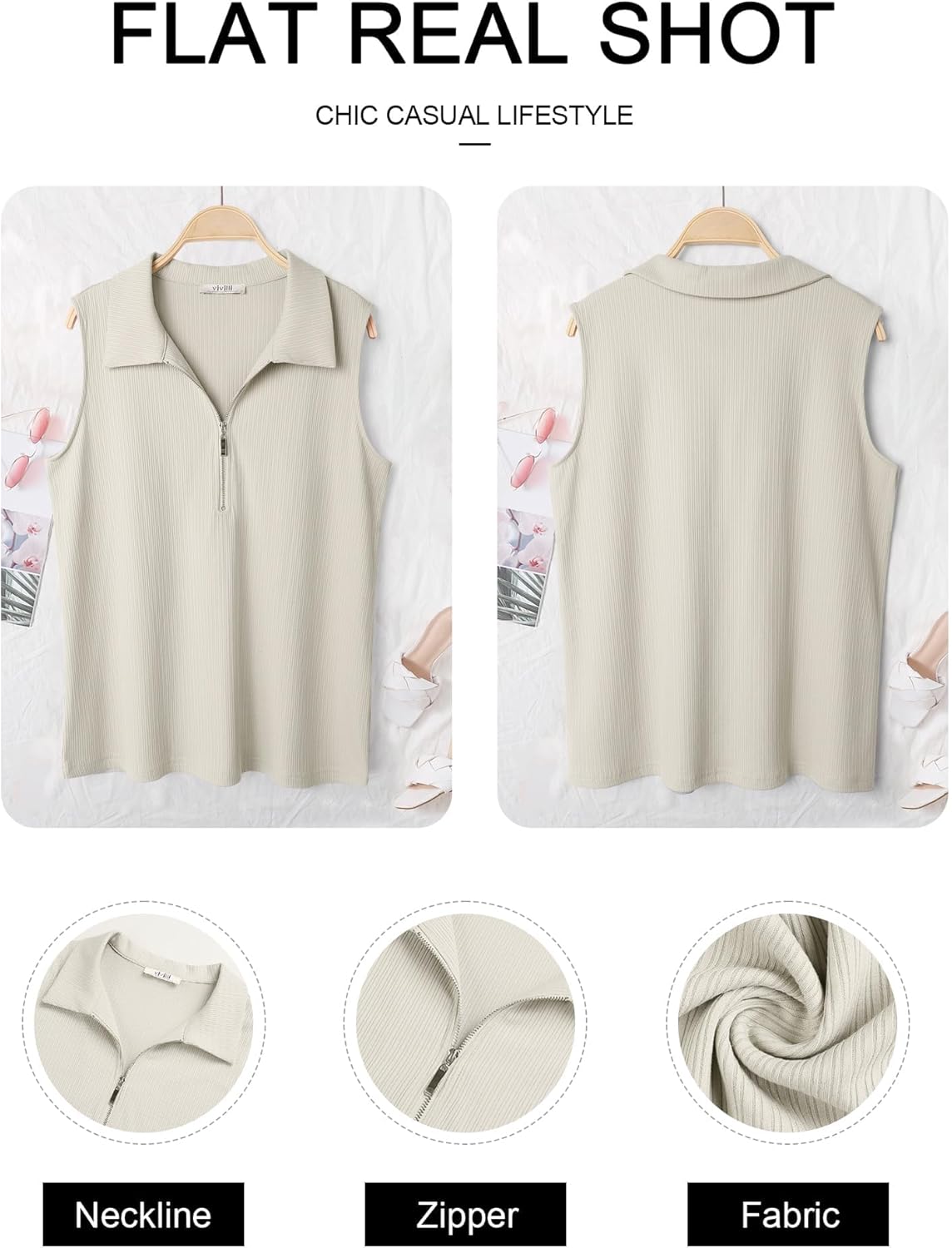 Our Zipper sleeveless tops with Great material that flows and not easily wrinkle and is a good length. Very flattering~ Basic tops for spring, summer, fall, and winter.